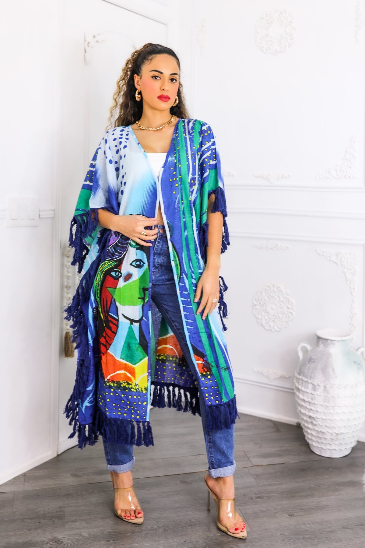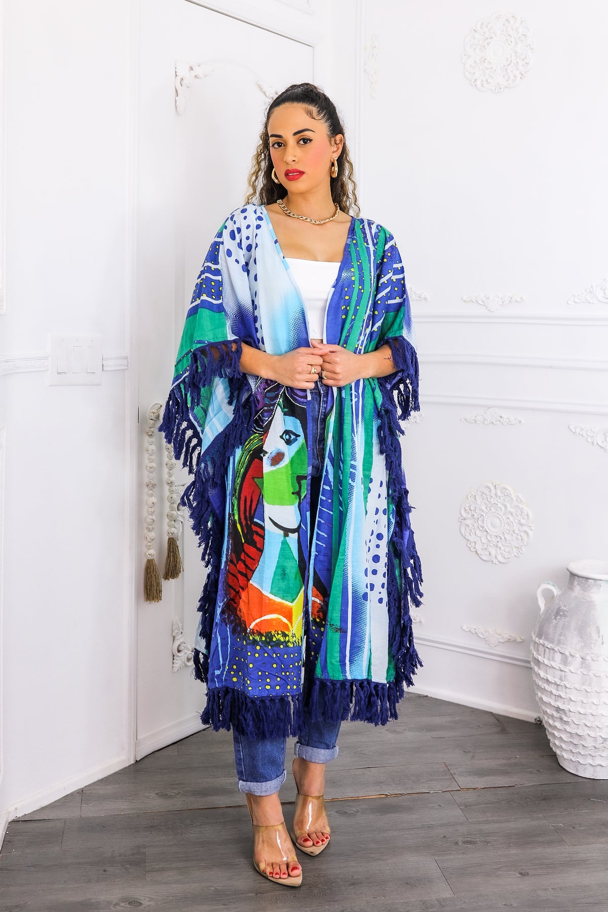 The Art Revealed Fringe Kimono combines functionality with aesthetic appeal. Designed for versatility, it enhances visual interest in various outfits while providing comfort. The fringe detail adds movement, making it suitable for layering or as a standalone piece in diverse settings, promoting both style and ease of wear.